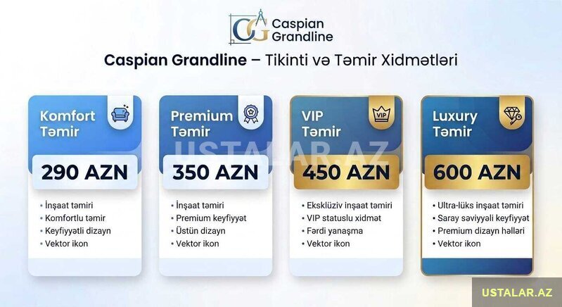 Şirkət250 Azn Caspian Grandline Təmir-Tikinti Şirkəti Evinizi yeniləmək və ya sıfırdan qurmaq istəyirsiniz? Peşəkar komandamızla bütün təmir-tikinti işlərini 0-dan tam hazır vəziyyətə qədər yüksək keyfiyyətlə həyata keçiririk