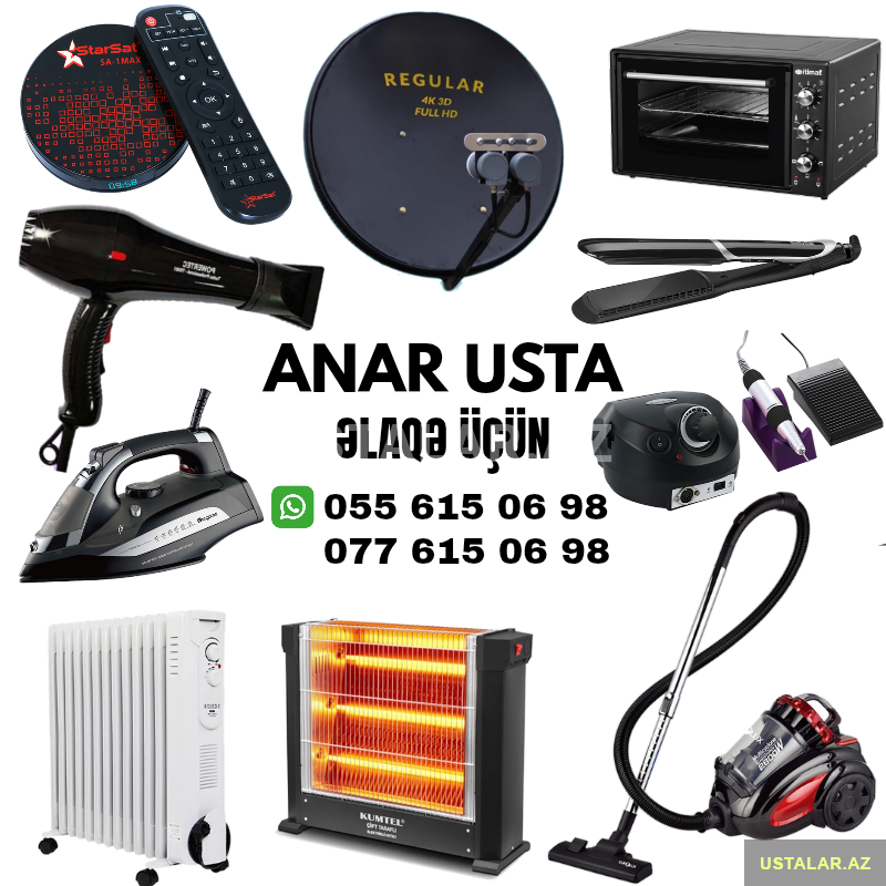 •Tozsoran, Ütü, Saç ütüsü, Saç Feni, Ət Çəkən, Mikrodalğalı soba, Çörək Peçi və sairə Ev məişət avadanlıqlarının təmiri.