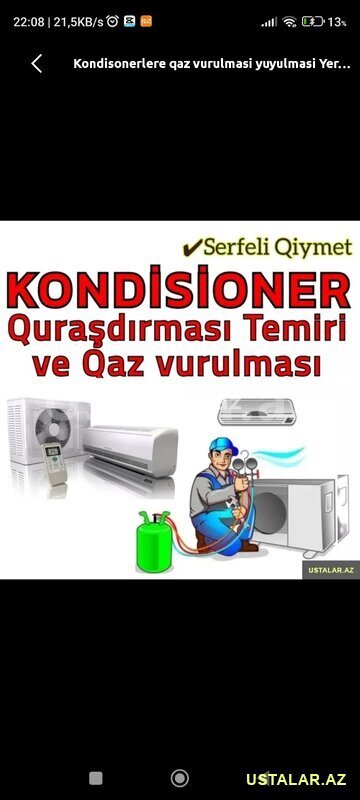 10 Azn Istenilen nov kondisioner ustasi ve yaranan problemlerin aradan qaldirilmasi gorulen islere zemanet texniki baxis yuksek keyfiyyet yalniz bizde Kondisionerlərin *Quraşdırılması *Diaqnostikası *Təmiri *Qazının