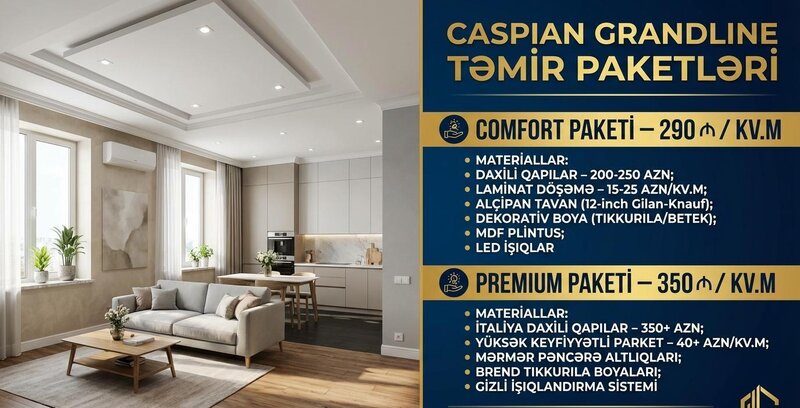 Şirkət290 Azn Yeni mənzil almısınız? Büdcənizi aşmadan, sürətli və keyfiyyətli təmir axtarırsınız? Caspian Grandline-ın "Smart Start" paketi ilə tanış olun! Cəmi 45 iş gününə açar təslim təmir. Keyfiyyətli materiallar və