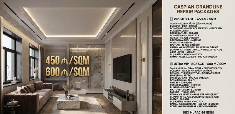 Şirkət200 Azn Yeni mənzil almısınız? Büdcənizi aşmadan, sürətli və keyfiyyətli təmir axtarırsınız? Caspian Grandline-ın "Smart Start" paketi ilə tanış olun! Cəmi 45 iş gününə açar təslim təmir. Keyfiyyətli materiallar və