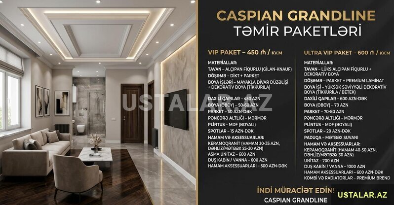 Şirkət7 Azn Yeni mənzil almısınız? Büdcənizi aşmadan, sürətli və keyfiyyətli təmir axtarırsınız? Caspian Grandline-ın "Smart Start" paketi ilə tanış olun! Cəmi 45 iş gününə açar təslim təmir. Keyfiyyətli materiallar və