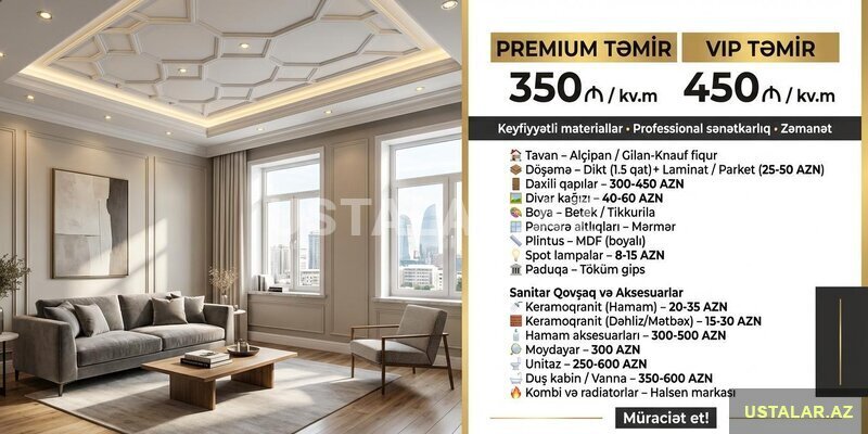 Şirkət350 Azn Təmir-Tikinti və Mebel İşləri Bir Arada! Evinizi sıfırdan tam hazır vəziyyətə gətiririk! Təmir və mebel işlərini ayrı-ayrı ustalara ehtiyac qalmadan, bir komandaya həvalə edin - vaxtınıza və büdcənizə qənaət edin